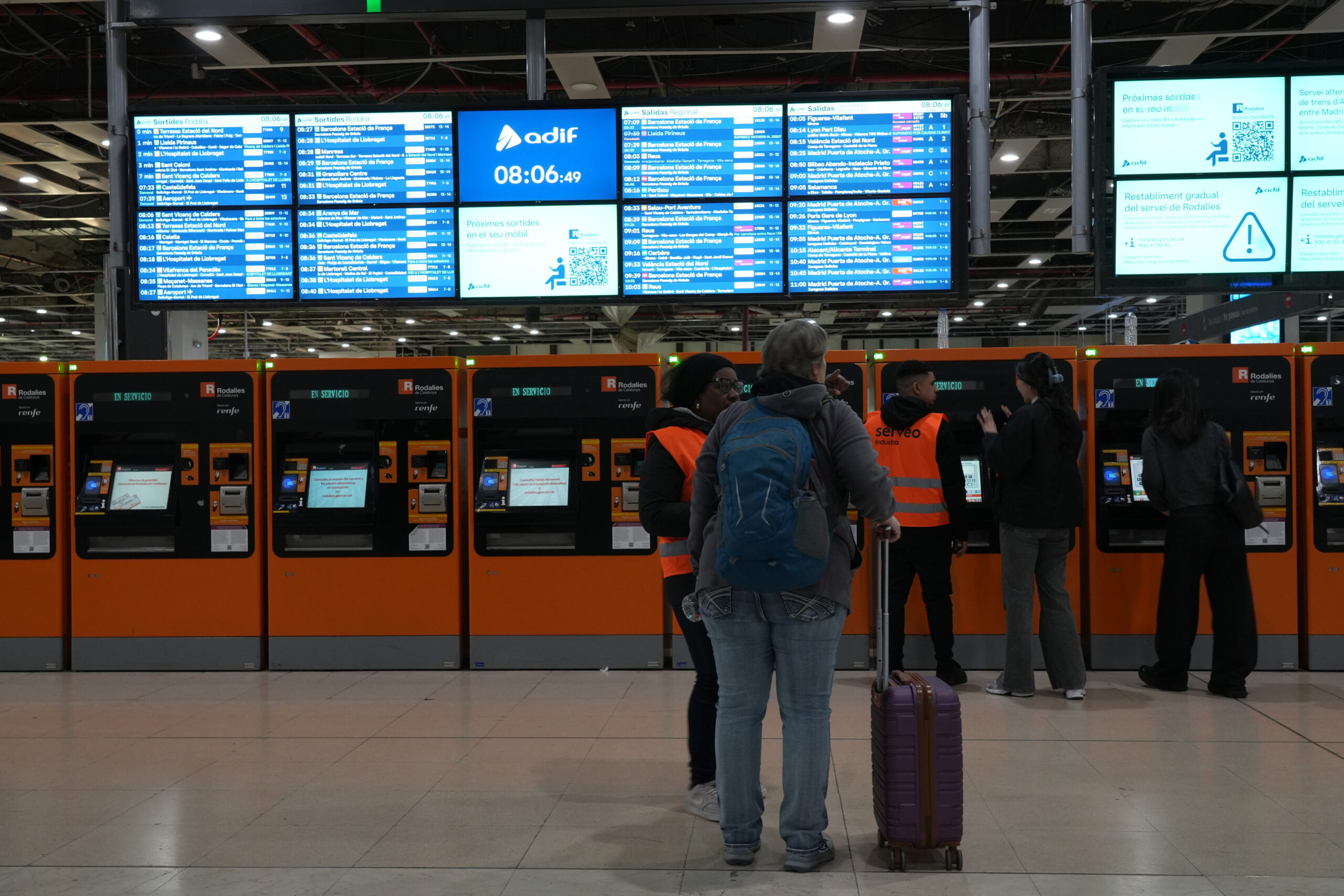 L’afluència a l’estació de Sants aquest dijous ha sigut més baixa de l’habitual, després de dies d’incidències i coincidint amb l’alerta vermella per risc extrem per la ventada activada. Entre els passatgers hi havia el Michael que es dirigia a Manresa i a qui han explicat que haurà d’anar a Terrassa Nord i allà agafar un bus. “No m’agrada molt la idea, a més és un dia una mica incòmode perquè hi ha molt vent i viatjar per carretera… El govern ha dit que no era dia per fer molts moviments”, ha dit.
