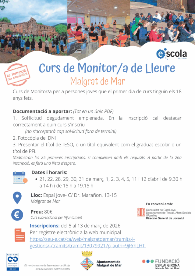 Podeu trobar més informació detallada [aquí](https://www.ajmalgrat.cat/comunicacio/noticies/inscripcions-per-al-nou-curs-de-monitors-de-lleure-del-5-al-13-de-marc.html).