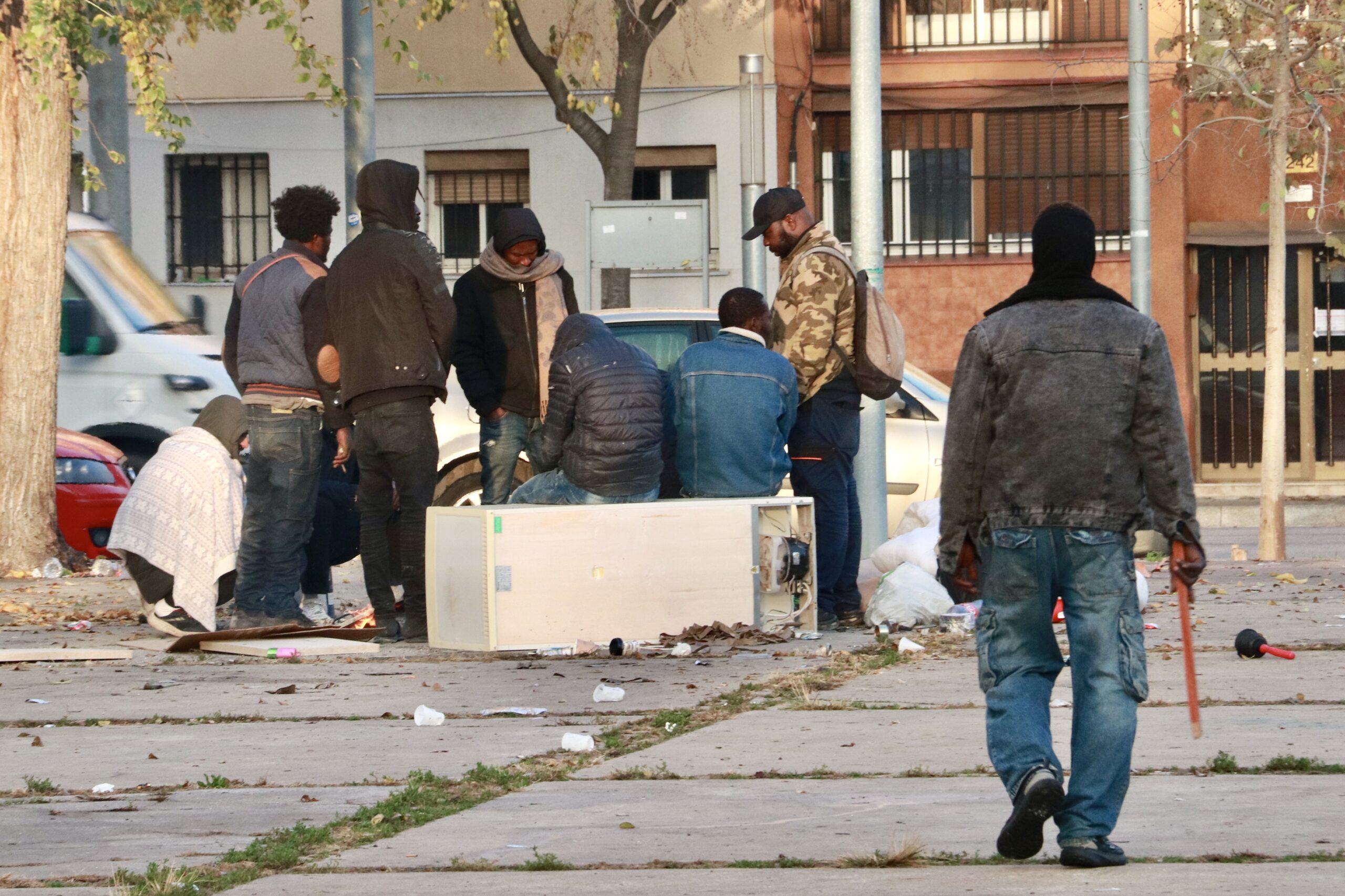 ACN Badalona – Prop d’un centenar de persones han passat la nit al ras davant de l’antic institut B9 de Badalona, després de ser desallotjats aquest dimecres. Aquests ciutadans han improvisat una acampada amb tendes de campanya, fogueres i ferralla a la plaça situada just davant de l’espai, que està acordonada per la policia. Agents del Grup d’Intervenció Especial de la Guàrdia Urbana de Badalona (GEIP) es troben també desplegats a la porta que dona accés a l’antic institut, vetllant perquè ningú pugui accedir a l’espai desallotjat. També hi ha operaris de la companyia de la llum que està tallant els subministraments que hi havia al B9. A l’espai hi havien arribat a malviure uns 400 migrants, però en el moment del desallotjament eren menys.