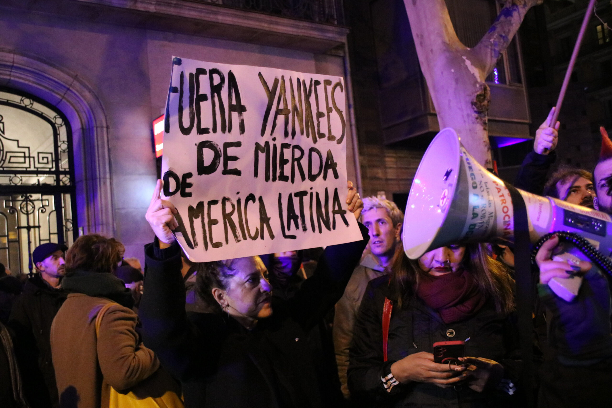 La protesta ha anat sumant manifestants amb el pas del temps, així com també s’han apropat grups de persones que han celebrat l’atac nord-americà. Han estat moments de tensió, que s’han anat replicant de forma puntual durant les prop de dues hores que s’ha allargat la concentració. Uns i altres s’han llançat escridasses com ‘no passaran’, ‘fora ianquis d’Amèrica Llatina’, ‘alerta, alerta que camina l’espasa de Bolívar per Amèrica Llatina’ o “Maduro a la presó’.